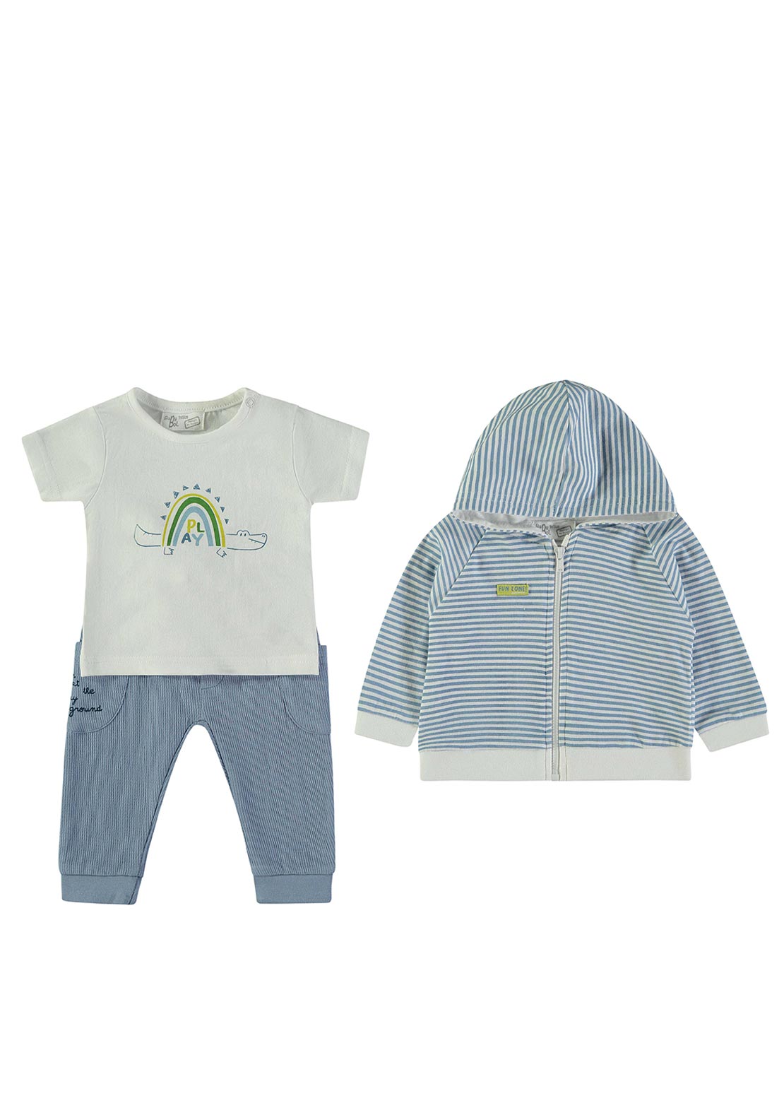 Babybol 3 piece set includes a striped blue and white zip up hoodie, a white t-shirt with a playful print in front and a blue trouser with elasticated waist.