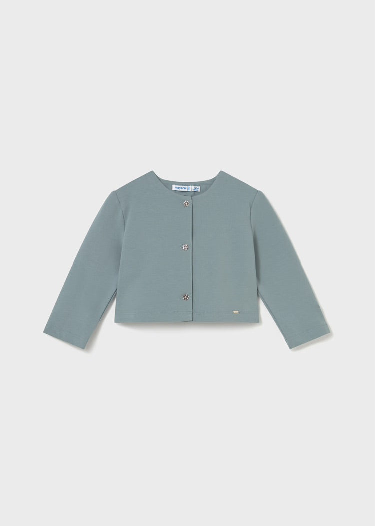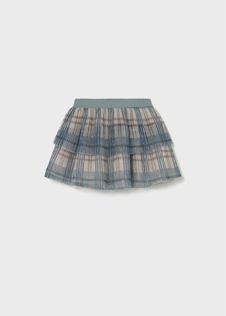 Three piece set for baby girl made up of a long sleeved jacket with decorative buttons and a long sleeved t shirt with printed detail on the front ,the check skirt has an elasticated waist and is fully lined .