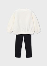 This two piece outfit includes a long sleeve cream sweatshirt with a black sequined bow and soft black leggings with elastic waistband.