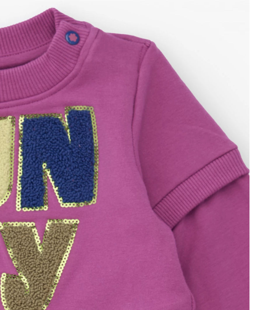 Stunning Tuc Tuc dress for girls in magenta pink with a colorful printed tulle skirt and shiny "FUN NY" logo on the chest.the long sleeves have a layered effect and a snap fasteners on the shoulder for easy dressing, a must have for the fashion conscious little girls wardrobe.