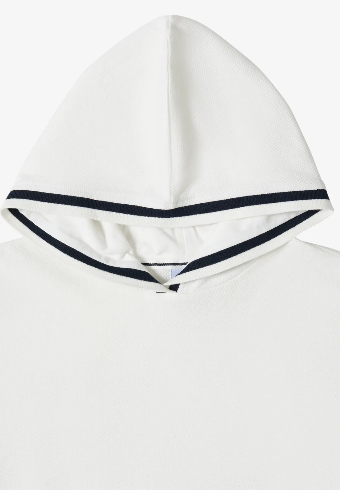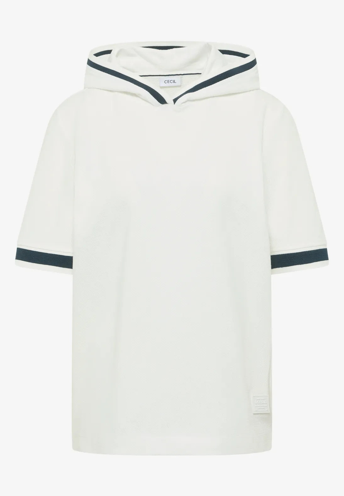 Cecil vanilla white structured top, hood with drawstrings, short sleeves and a ribbed detail and contrasting stripes.