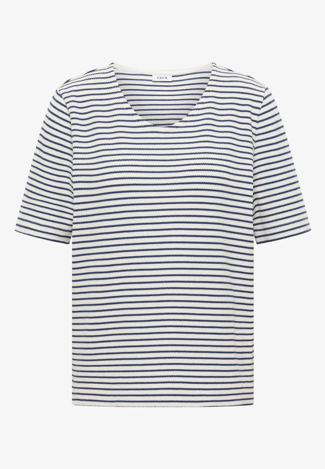This striped women’s shirt by CECIL has a V-neckline and a subtle waffle texture add a stylish touch, while the side slits at the hem ensure extra freedom of movement .