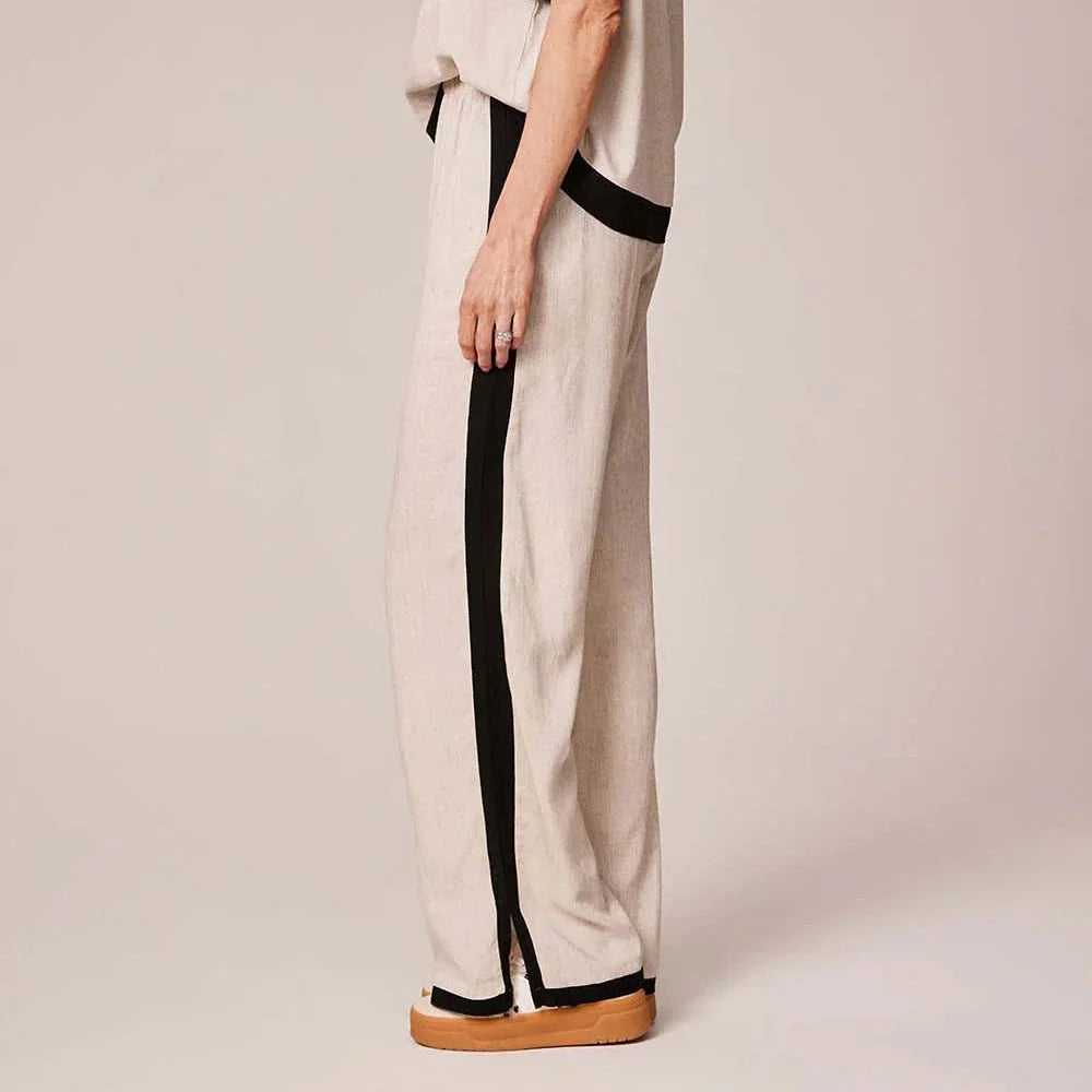 These deck by decollage trousers in beige with black contrast detailing are crafted from a viscose and linen blend that's soft against the skin and breathable. The comfortable elasticated waistband and flattering silhouette make them a perfect piece for effortless, everyday style.