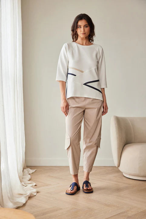 This stylish and versatile top from Peruzzi offers the perfect blend of everyday comfort and modern elegance. The classic Ecru and Navy colour combination creates a chic, nautical-inspired look that remains a timeless .The standout feature is the zip detail that adds a contemporary touch.