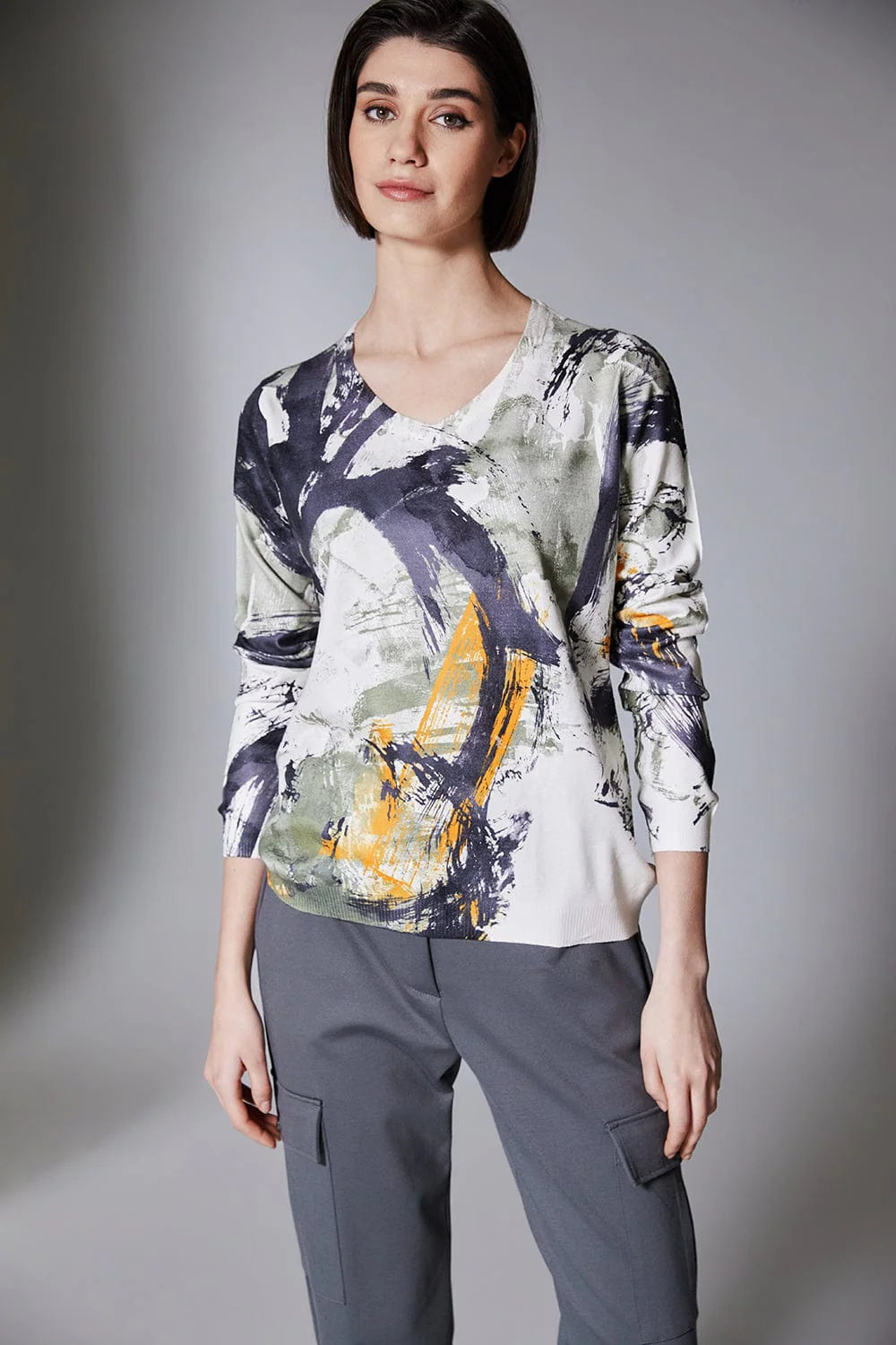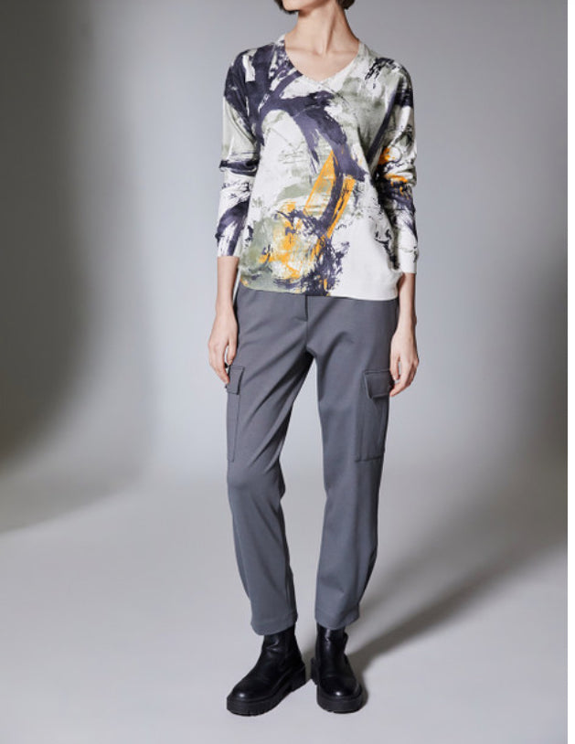 PERUZZI swirl print knit features a flattering v-neck, long sleeves and can be worn with trouser or jean to complete the look.