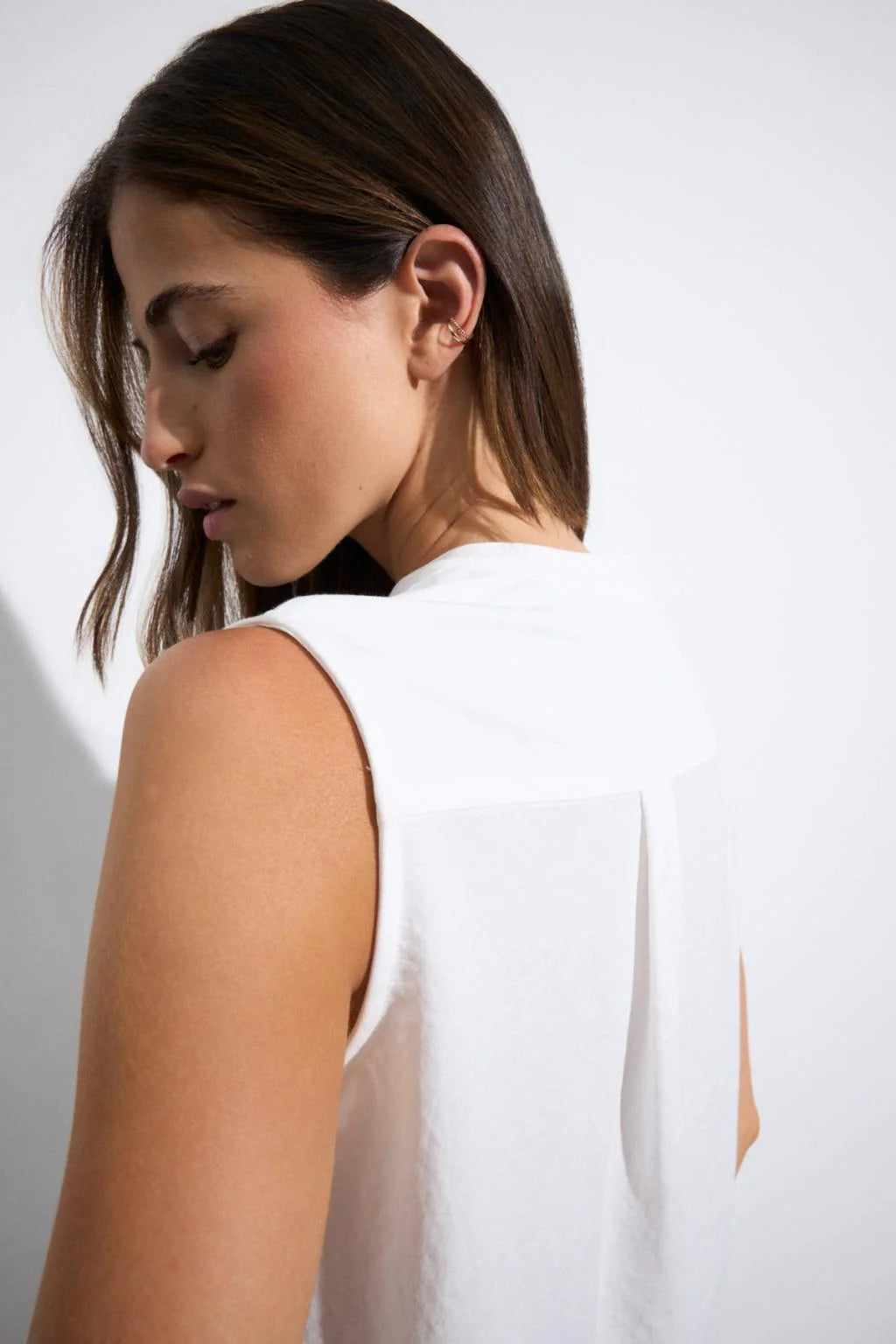 Plain stretch knit blouse. Loose, straight cut. Soft and lightweight fabric. Round neckline with a V-neck and ethnic-inspired ribbon detail. Front button closure in matching color. Back pleat. Longer hem at the back.