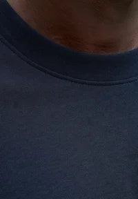 Navy t-shirt with a crew neck and a print pattern in front.