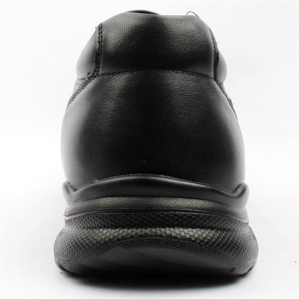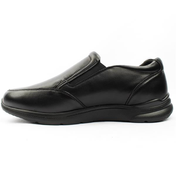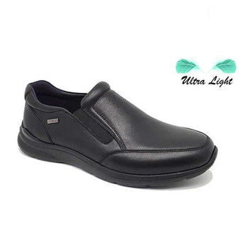 Black slip-on shoe with leather uppers, lightweight and flexible with a Tex lining which makes them shower proof.