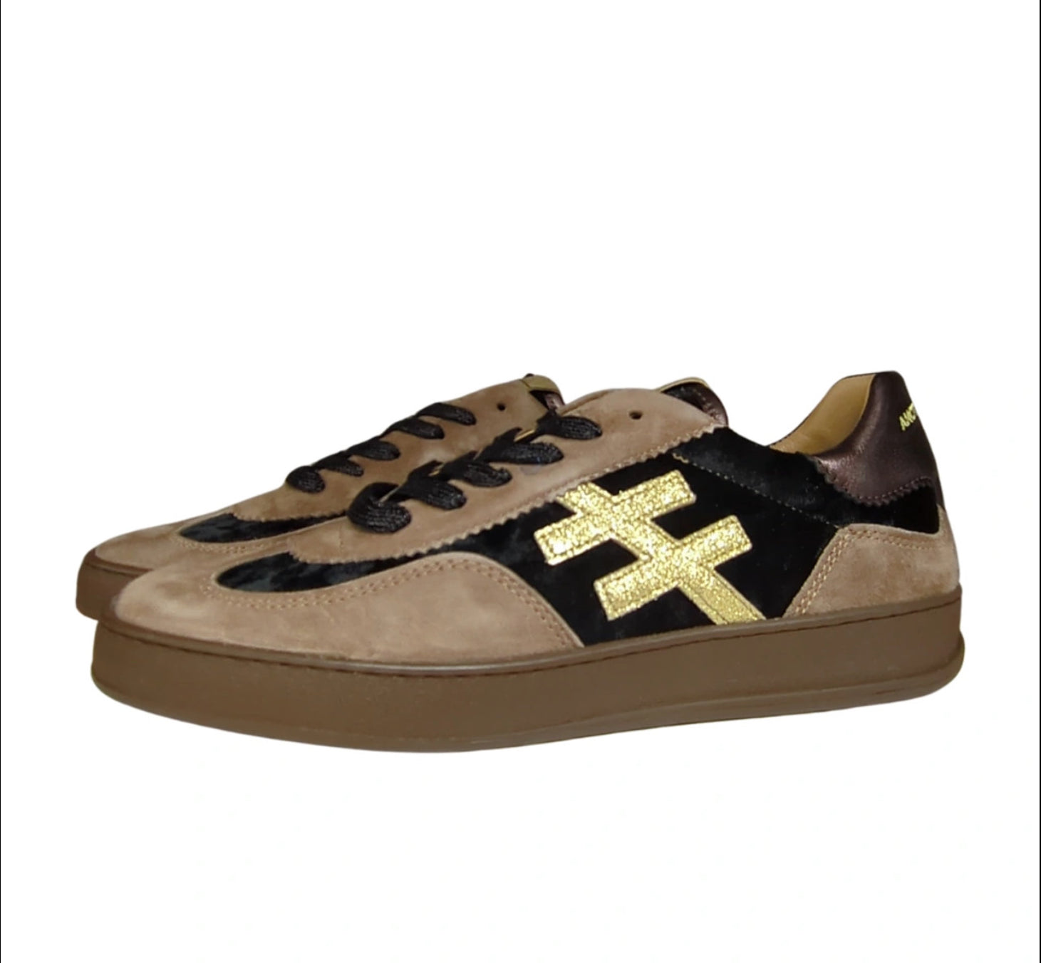 Taupe and black trainers with a brown trim on the heel with secure lace up closure and removable insoles .