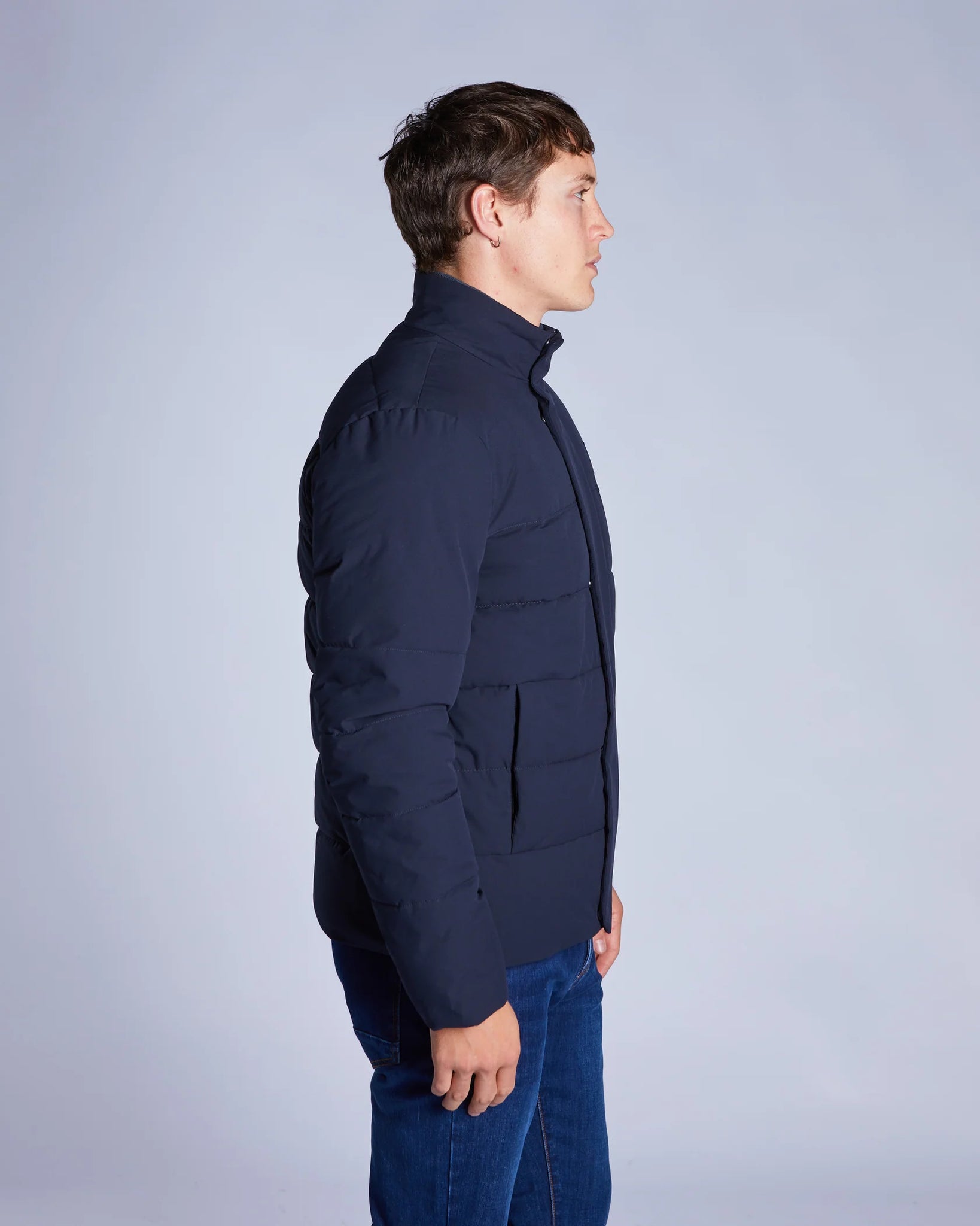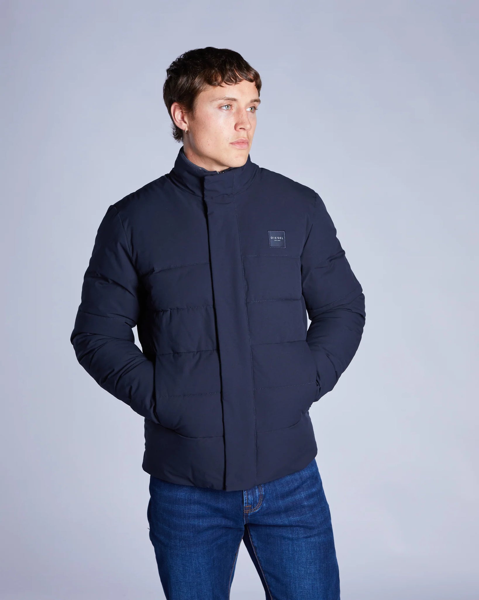 This mid-weight jacket is a must have for a smarter look this Autumn/Winter season. Crafted with a matte polyester shell and recycled polyester filling. Featuring a concealed zip closure to the front, zipped front pockets, one interior pocket, a stand collar with an internal rib detail and ribbed concealed cuffs. It has our premium Diesel embroidered badge on chest.