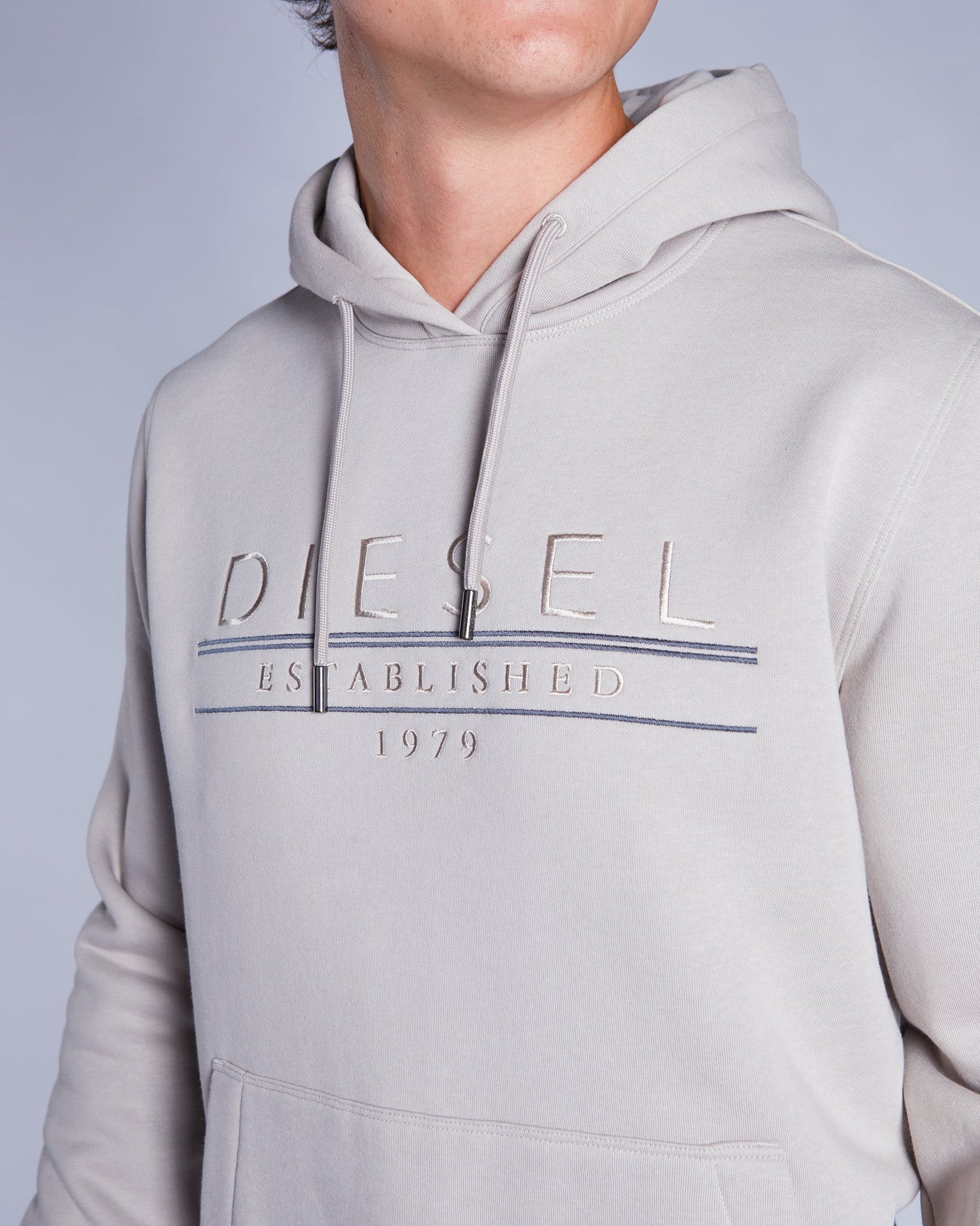 Premium organic cotton sweat fleece hoodie with kangaroo front pocket. DIESEL embroidered artwork on the chest. Self fabric hood lining. Pair with a pair of our jeans for a smart casual look.