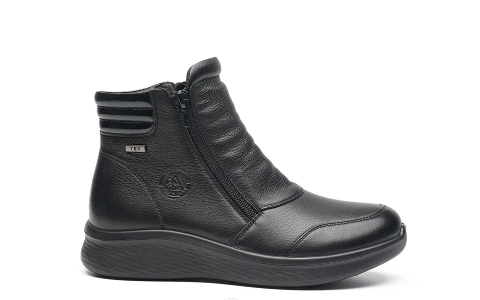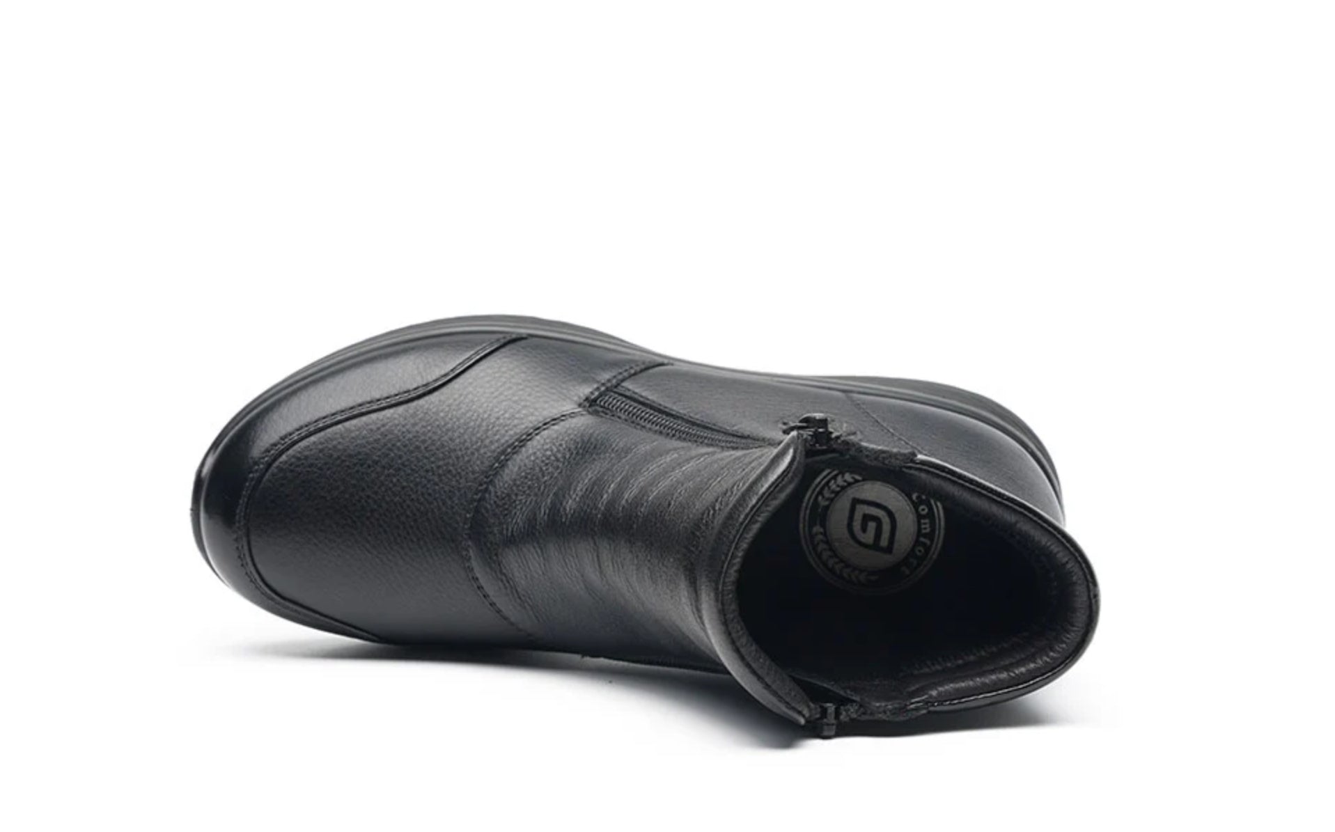 G Comfort women’s black leather ankle boot with a wide fit,a convenient side zip and waterproof material.