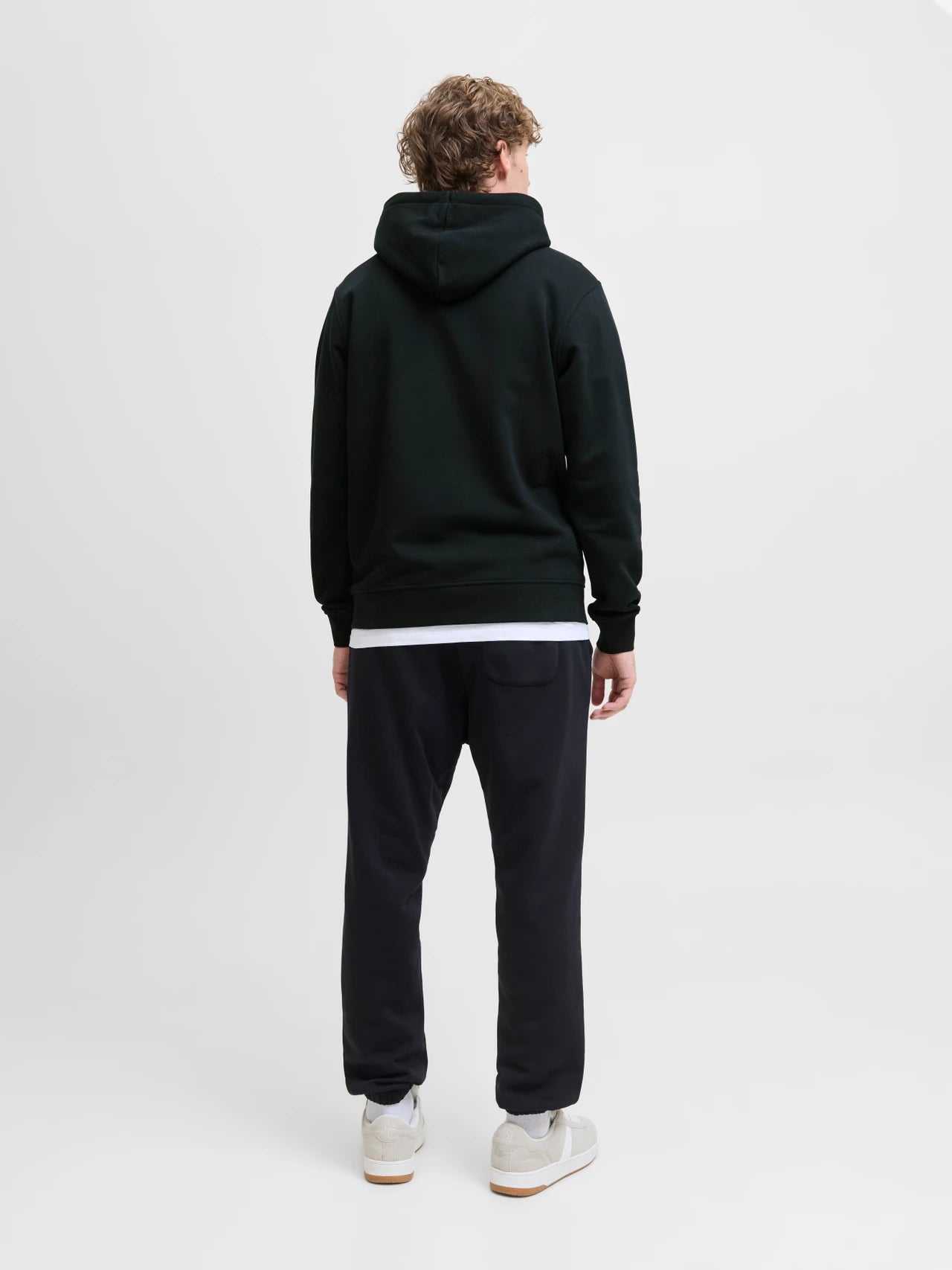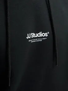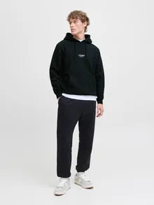 Black hoodie with long sleeves and pockets in front and has a brushed fabric with a soft finish on the inside.